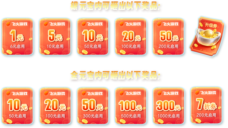 3、如果您砸出了金元宝升级券,您的银元宝将在活动期间永久升级为金元宝,如果是活动最后一日才砸出金元宝升级券,则次日不可升级。砸开金元宝后将有概率获得红包和7折券,每个奖品单日只可被砸出一次;