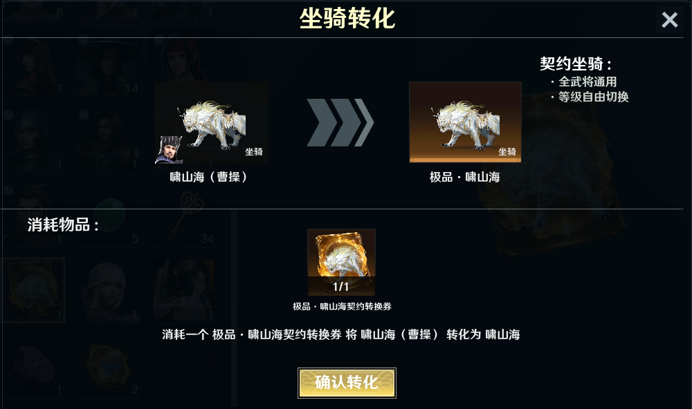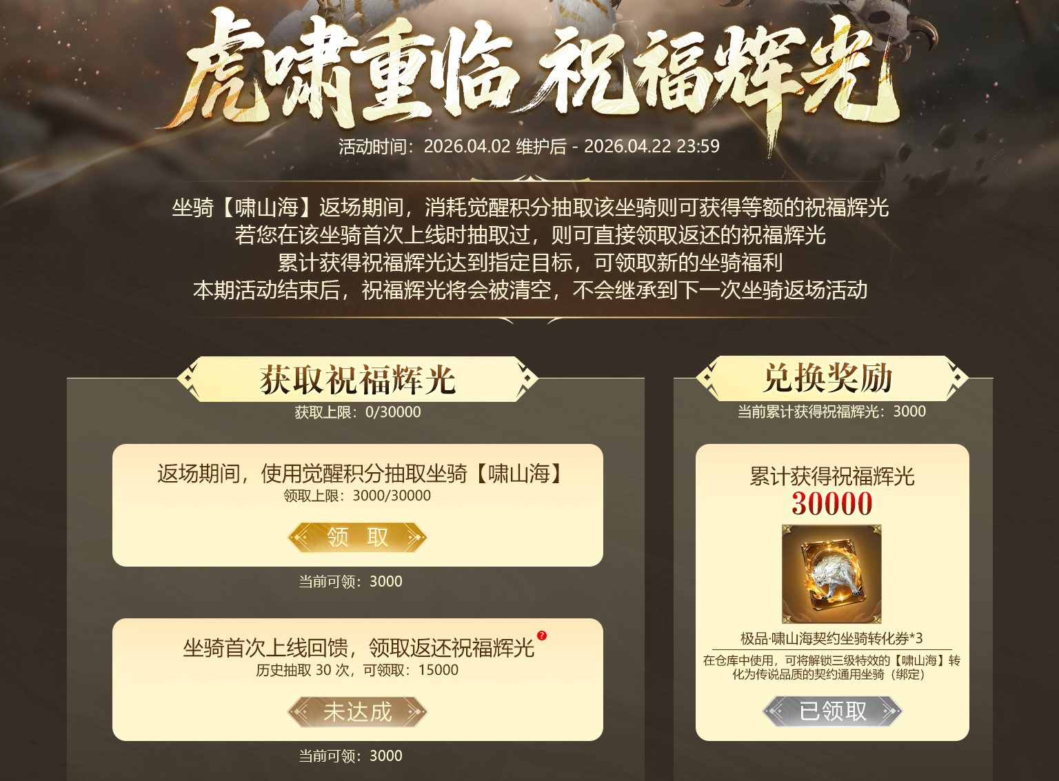 累计获得祝福辉光达到指定目标,可领取至多3张【啸山海契约转换券】,能将解锁三级特效的【啸山海】转化为传说品质的契约通用坐骑。