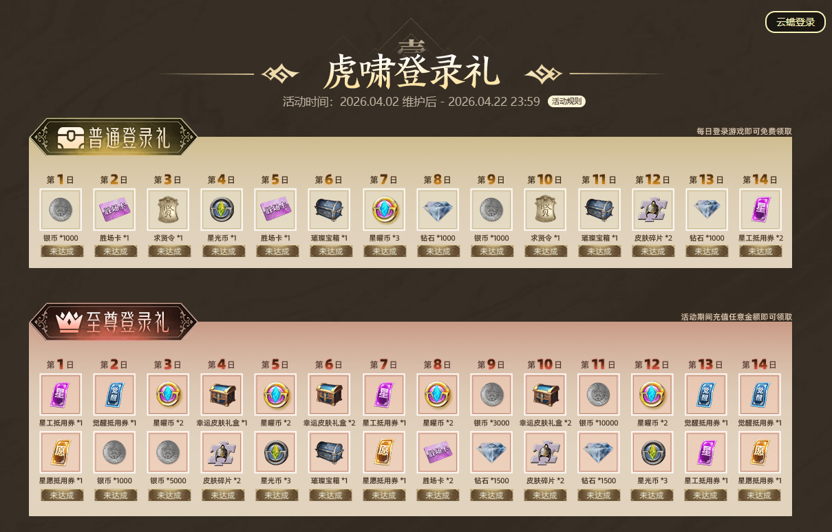 4月2日—4月22日活动期间,各位君主每日登录游戏即可免费领取璀璨宝箱、皮肤碎片等福利,连续14天畅领!活动期间充值任意金额,即可升级至尊登录礼,领觉醒抵用券等奖励!