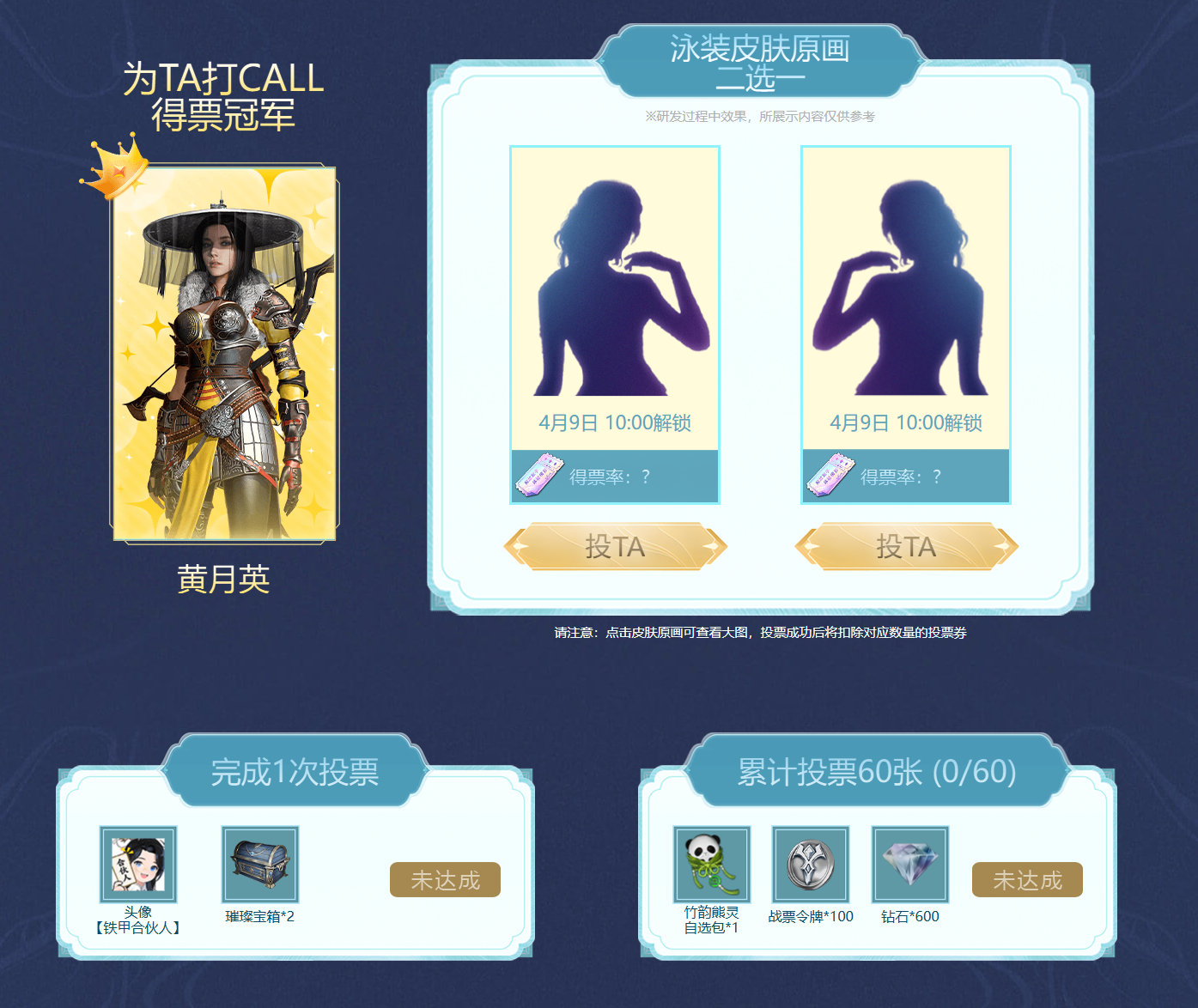 完成指定任务可获得投票券,4月9日10:00将解锁两版皮肤原画供大家投票,得票率高者将成为今年夏日上线的泳装皮肤!