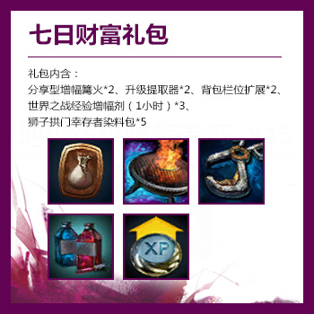 礼包内含:分享型增幅篝火*2、升级提取器*2、背包栏位扩展*2、世界之战经验增幅剂(1小时)*3、狮子拱门幸存者染料包*5