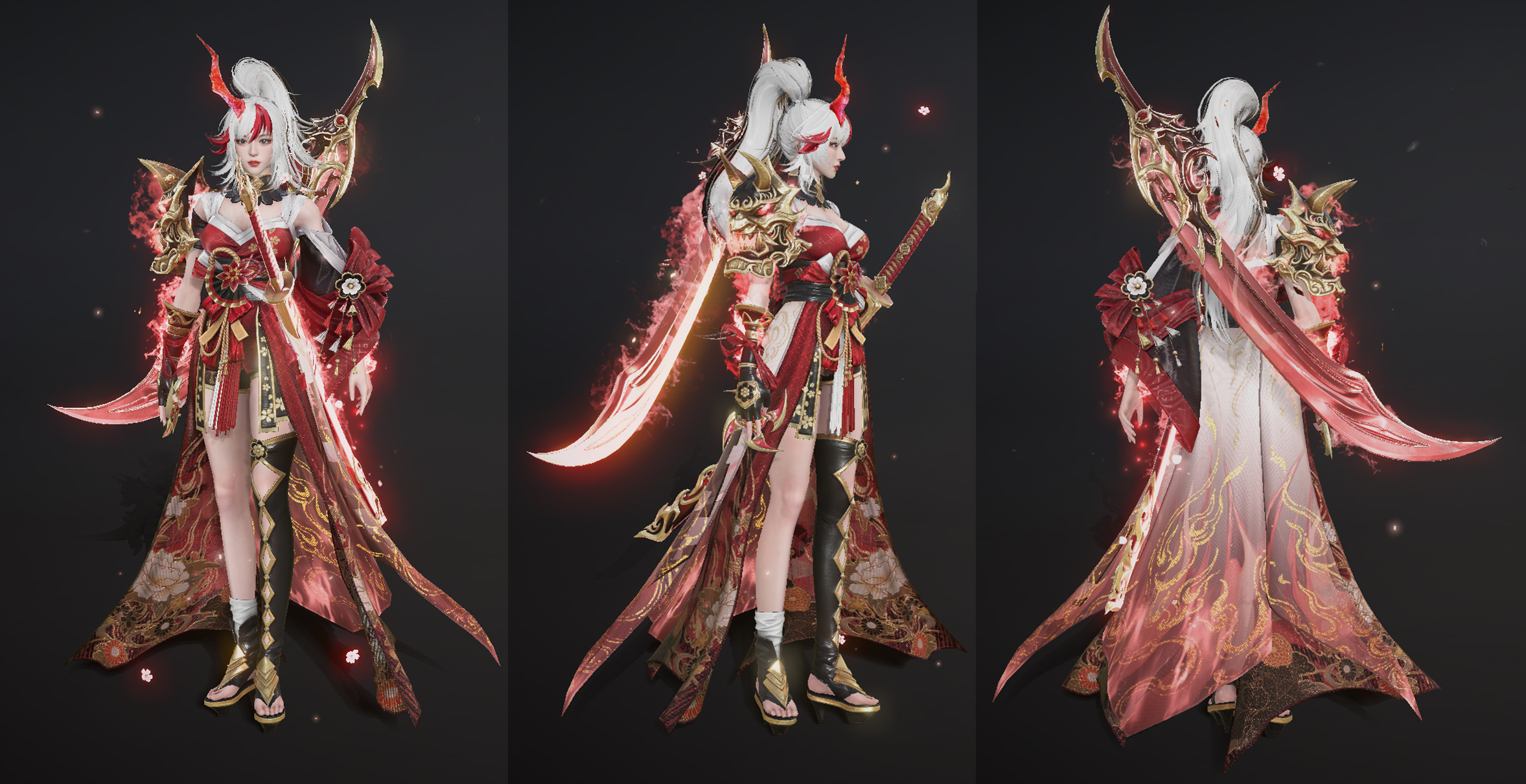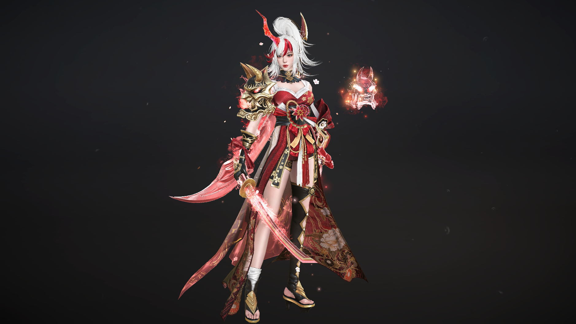 伊贺胧-赤鬼天姬:她是当世最为强大的妖姬,从赤鬼血肉中诞生,身披赤金镶红的华丽振袖,鬼面纹刺绣随灵力流转泛着金光。据说她是一位亡国的公主,具有王族的尊贵。