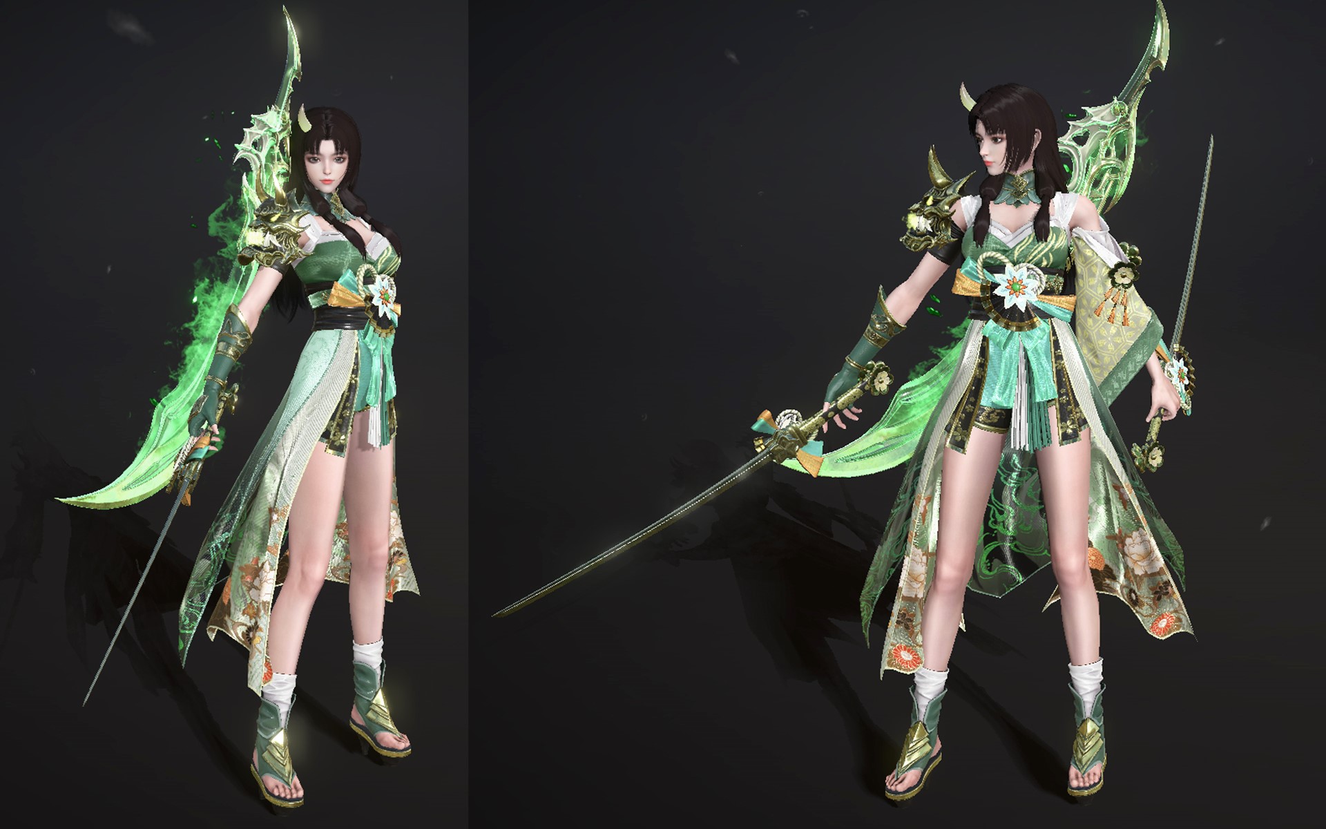 望月千代女手持碧翠双刀,服饰以青绿渐变织纹模拟藤蔓攀援之态,裙摆缀白色小花,青藤缚笼缠于臂间,表现藤妖的生机与妖异。