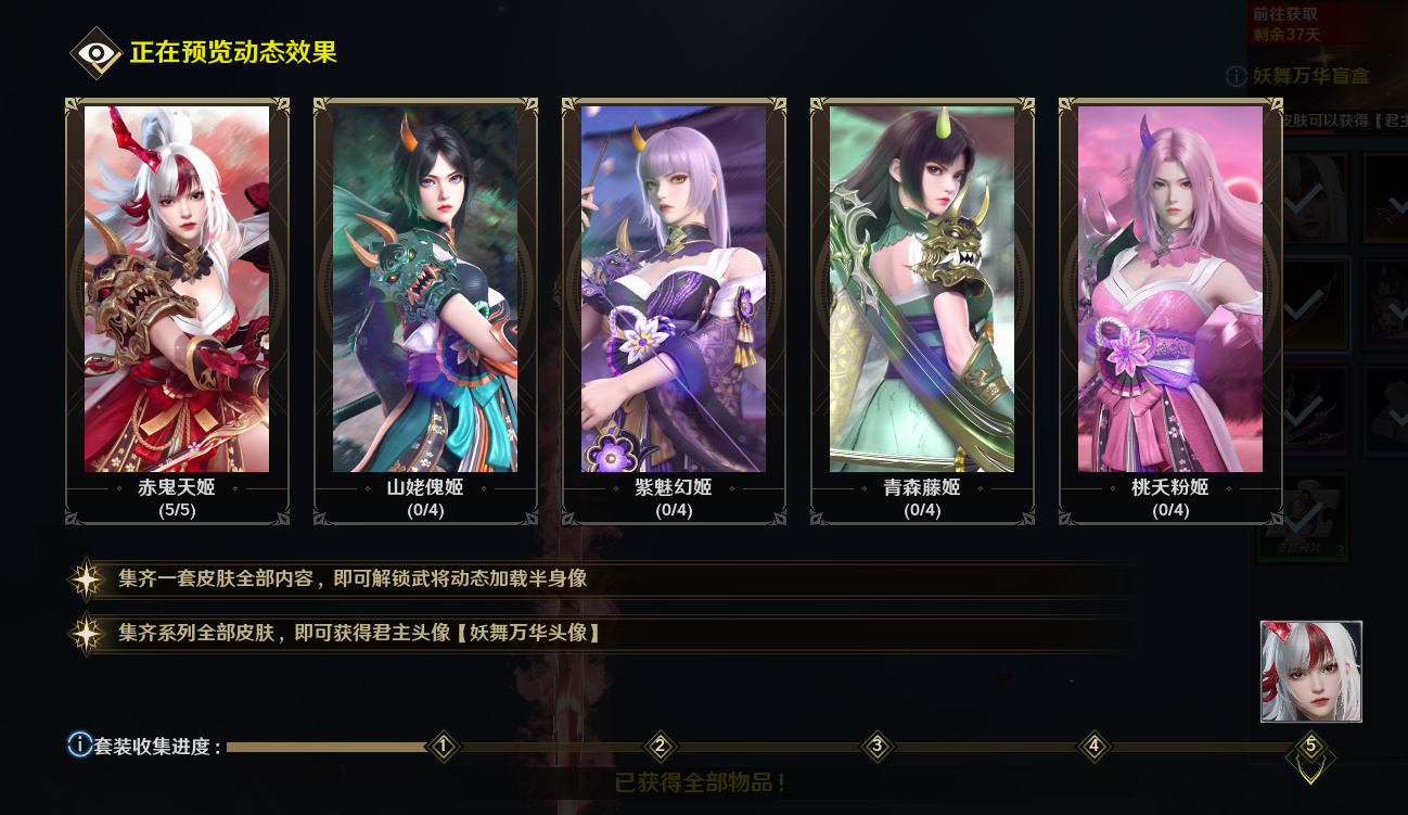 当集齐全部“妖舞万华”系列皮肤,即可获得君主头像【妖舞万华】。