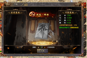 2、消耗道具提升拜帖系统等级,可增加大量属性并且解锁更高层数的演武场副本