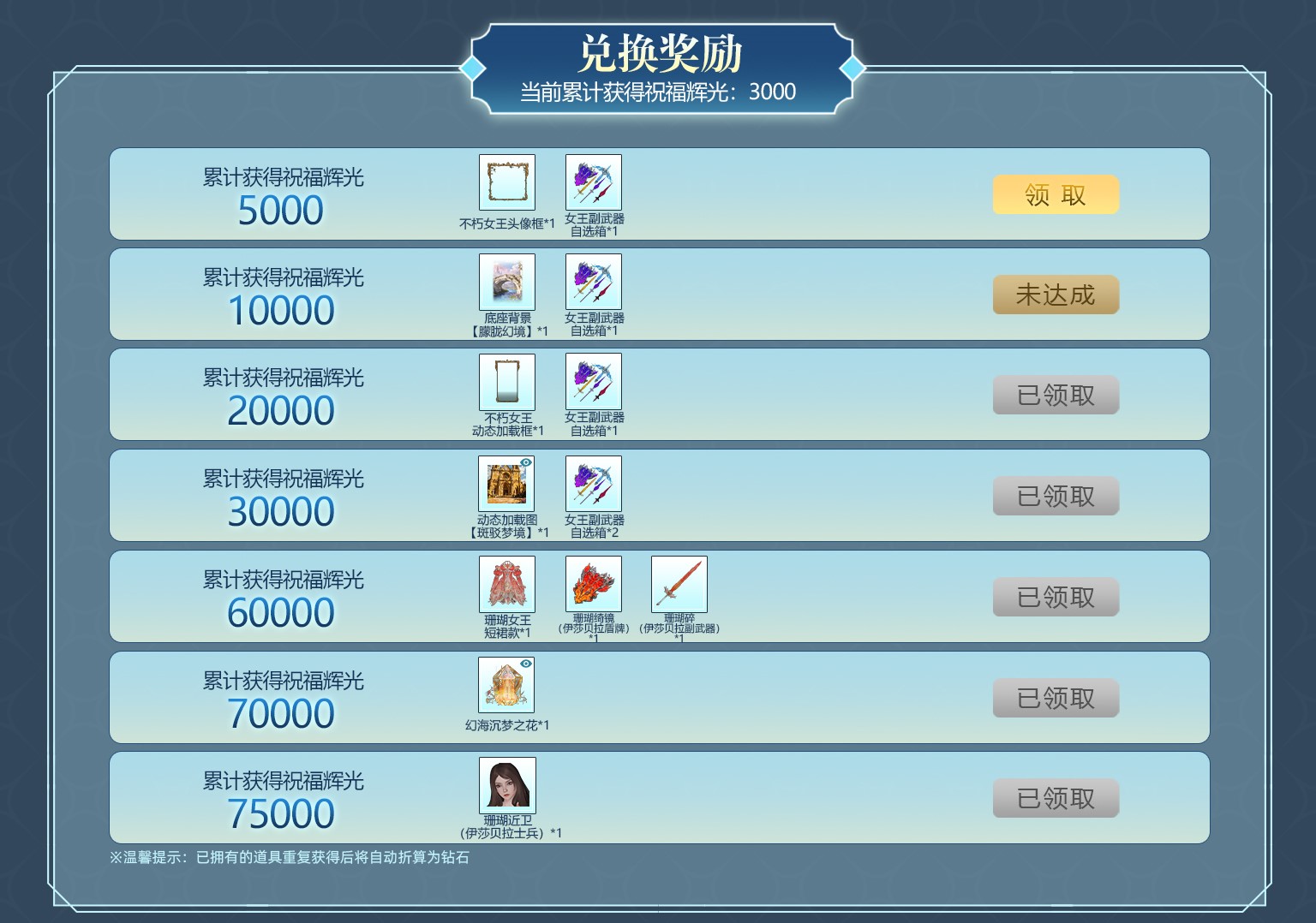 累计获得祝福辉光达到指定数量,即可领取新的盲盒配套福利(含伊莎贝拉典藏兵皮哦)。本期活动结束后,祝福辉光将会被清空,不会继承到下一次盲盒返场活动。