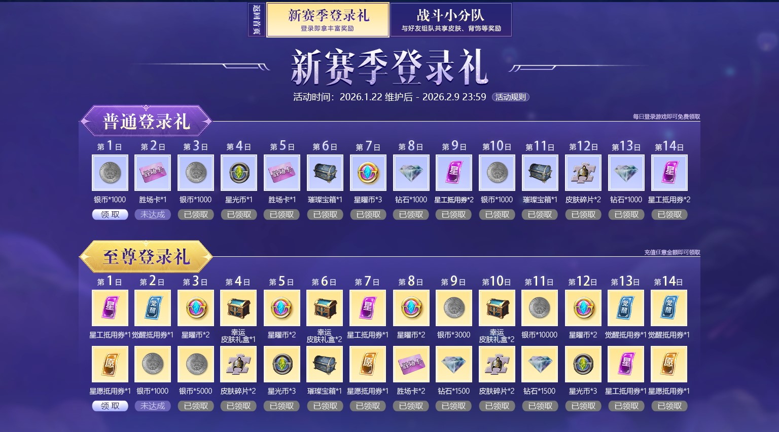 1月22日至2月9日活动期间,每日登录活动页面即可领取免费的14日登录礼奖励!充值任意金额,还可额外获得至尊登录礼,内含觉醒抵用券、璀璨宝箱等众多奖励!