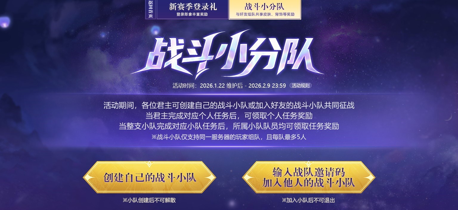 兄弟同心,其利断金!1月22日至2月9日,各位君主可创建自己的战斗小队或加入好友的战斗小队共同征战。当君主完成对应个人任务后,可领取个人任务奖励;当整支小队完成对应小队任务后,所属小队队员均可领取任务奖励。