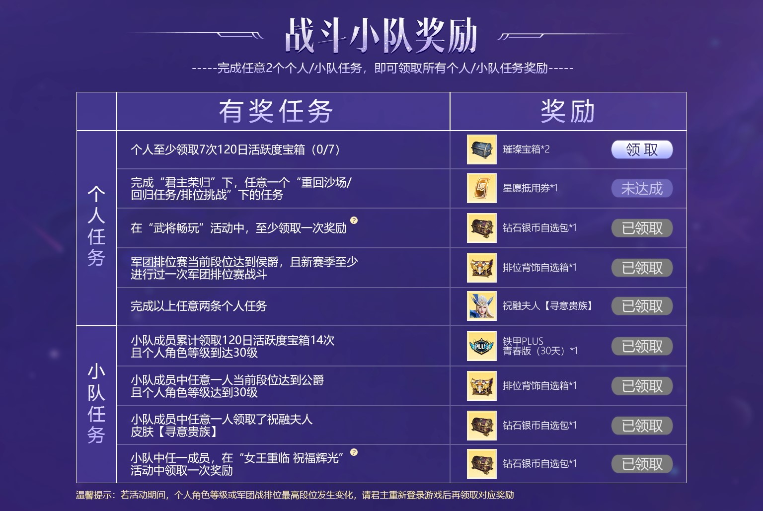 当任意完成两条个人任务后,可领取祝融夫人全新皮肤【寻意贵族】。当完成其它个人任务,以及团队完成小队任务后,可获得铁甲PLUS青春版、背饰自选箱等丰厚好礼!
