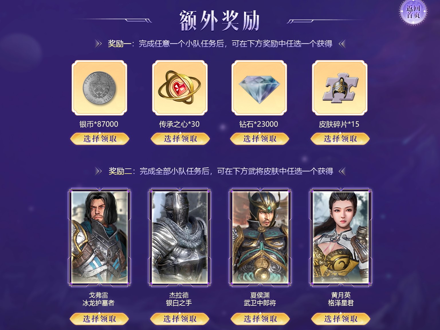 此外,完成相应任务还有额外奖励可领取,含传承之心、皮肤碎片等。当完成全部小队任务后,可选择获取戈弗雷、杰拉德、夏侯渊、黄月英4个武将皮肤中的1个皮肤。