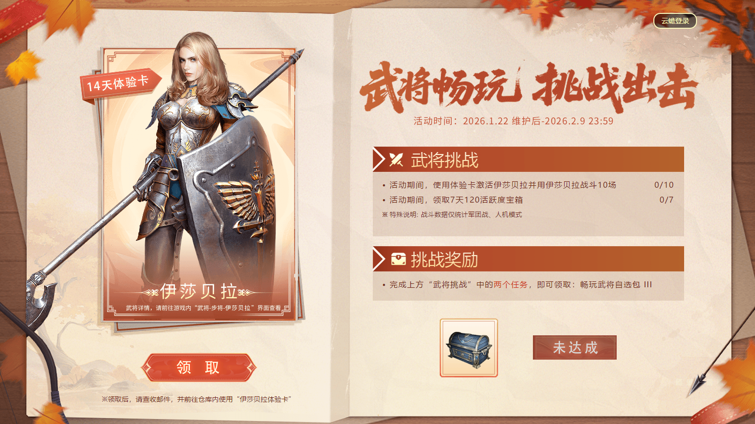 1月22日至2月9日,可直接在活动页面领取伊莎贝拉14天体验卡。当激活伊莎贝拉并使用她战斗10场、领取7天120活跃度宝箱后,即可领取挑战奖励宝箱,打开后可选择获得永久武将伊莎贝拉或银币78000!