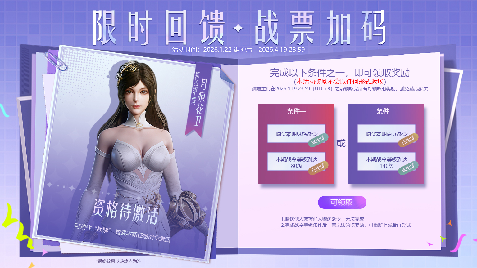 1月22日至4月19日,购买新赛季战票并达到相应战票等级条件后,可获得蔡文姬士兵皮肤月痕花卫。本活动奖励不会以任何形式返场,君主们可千万不要错过哦!