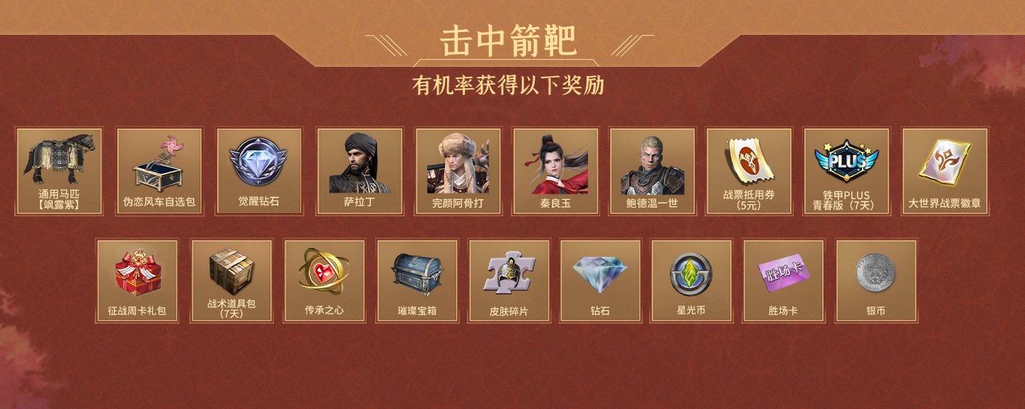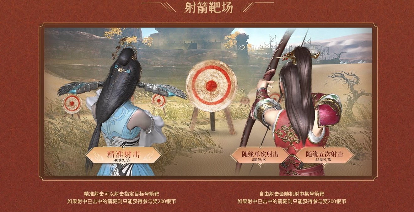 拥有箭矢后,可选择精准射击、随缘射击两种方式射击靶场,两种方式各有优势,都有机会射中大奖,君主可根据自己的偏好选取。