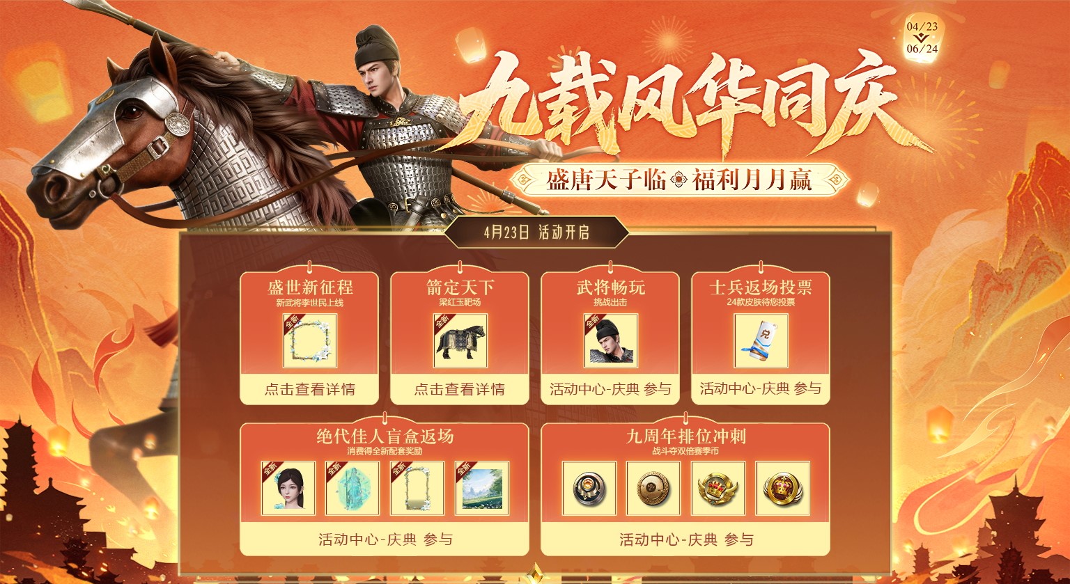盛唐天子临,九载风华庆。新武将、全新赛季版本将于4月23日隆重开启,超多福利不容错过!快来和李世民一起打造铁甲大陆的辉煌盛世吧!
