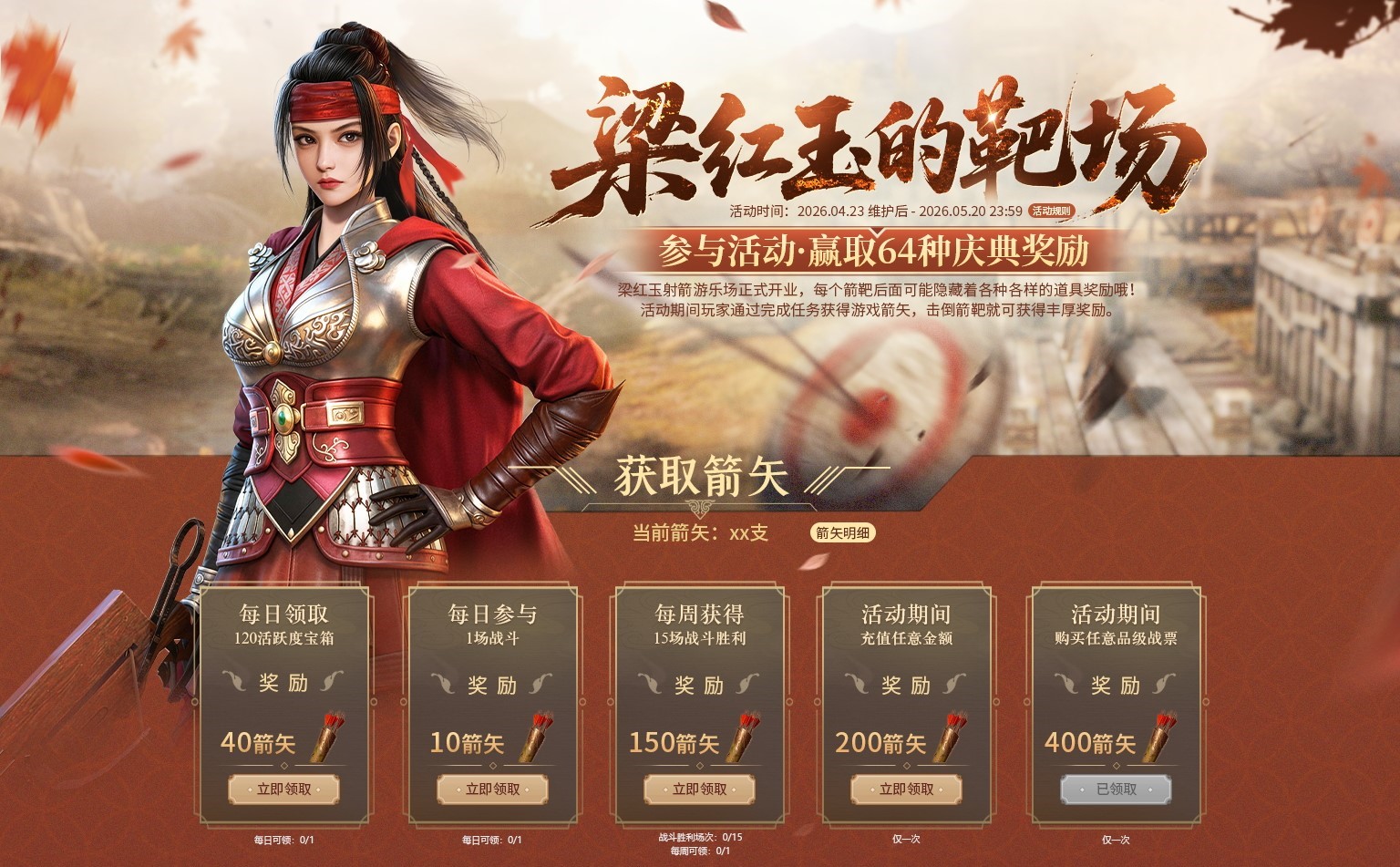 4月23日—5月20日活动期间,梁红玉的靶场正式营业,通过完成任务获得游戏箭矢,击倒箭靶就可获得64种庆典奖励。箭靶后面隐藏着包含飒露紫在内的惊喜福利哦!