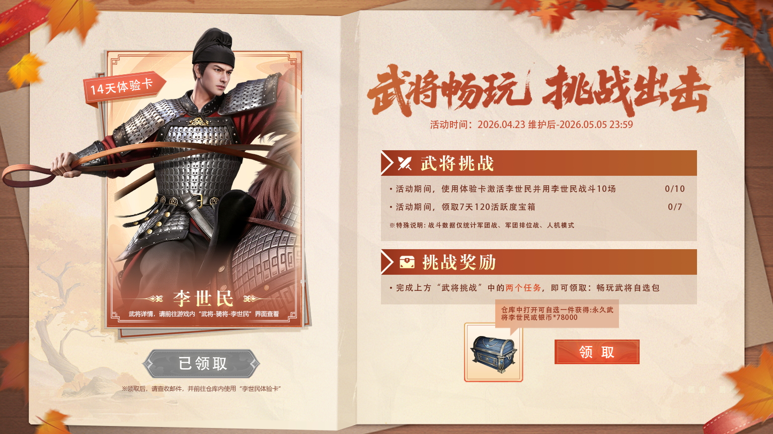 4月23日至5月5日活动期间,可直接在活动页面领取新武将李世民14天体验卡。没有门槛,全民点击就送,畅玩新武将!