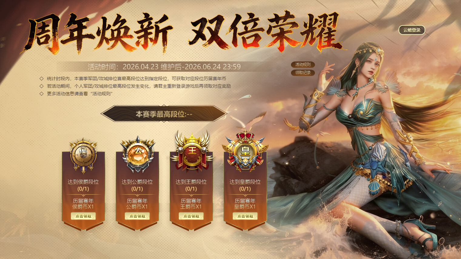 新赛季即将上线,排位段位也马上到结算时刻。4月23日至6月24日活动期间,本赛季军团/攻城排位赛最高段位达到指定段位,即可额外获取对应段位历届赛年币。