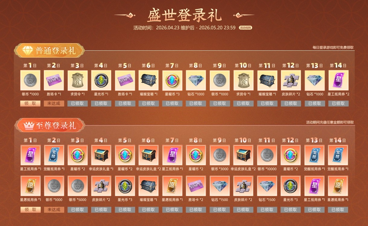 4月23日至5月20日活动期间,每日登录活动页面即可领取免费的14日登录礼奖励!充值任意金额,还可额外获得至尊登录礼,内含觉醒抵用券、璀璨宝箱等众多奖励!