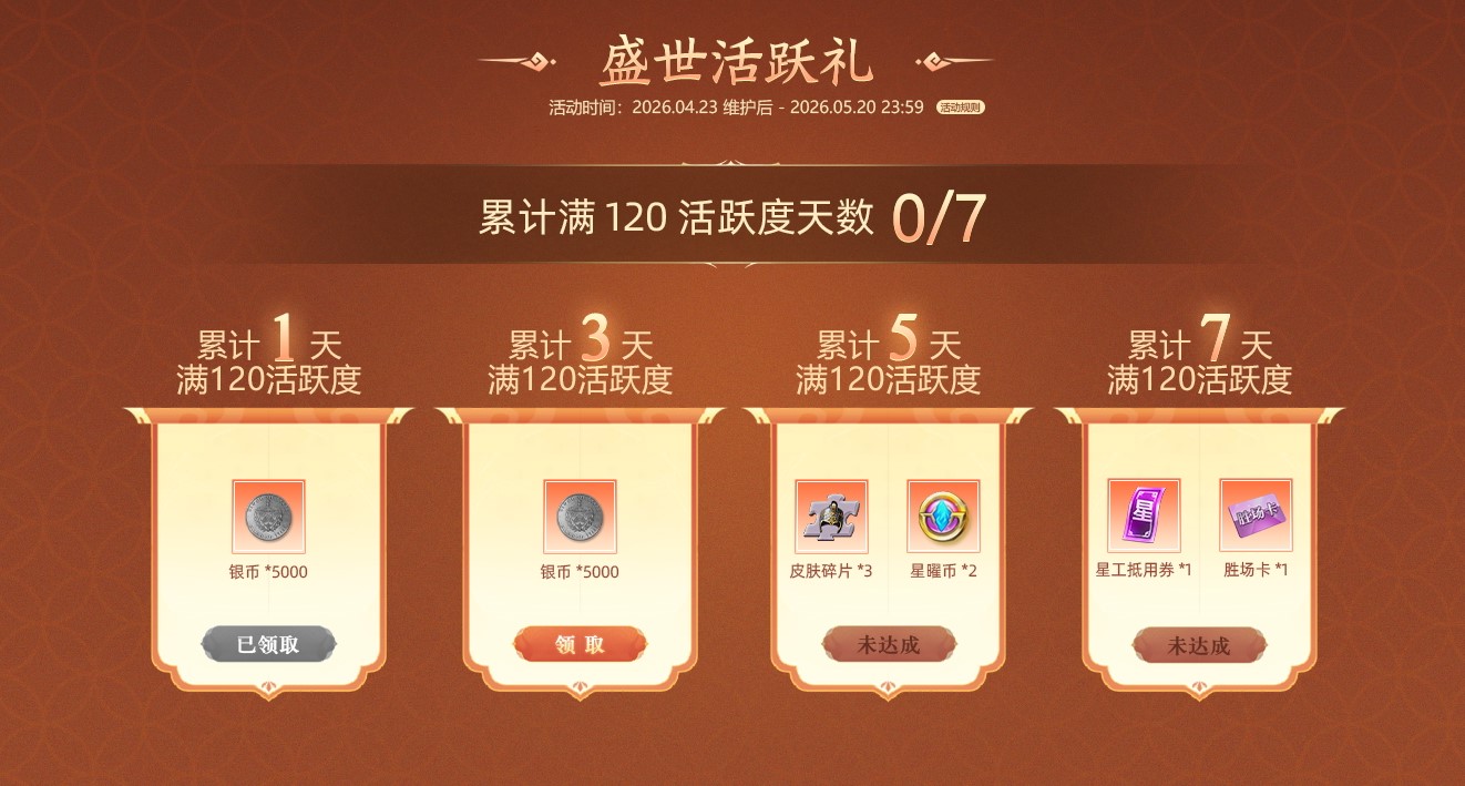 4月23日至5月20日活动期间,各位君主可通过完成每日任务积累活跃度,当满120活跃度分别累计达1/3/5/7天,可获得对应福利。