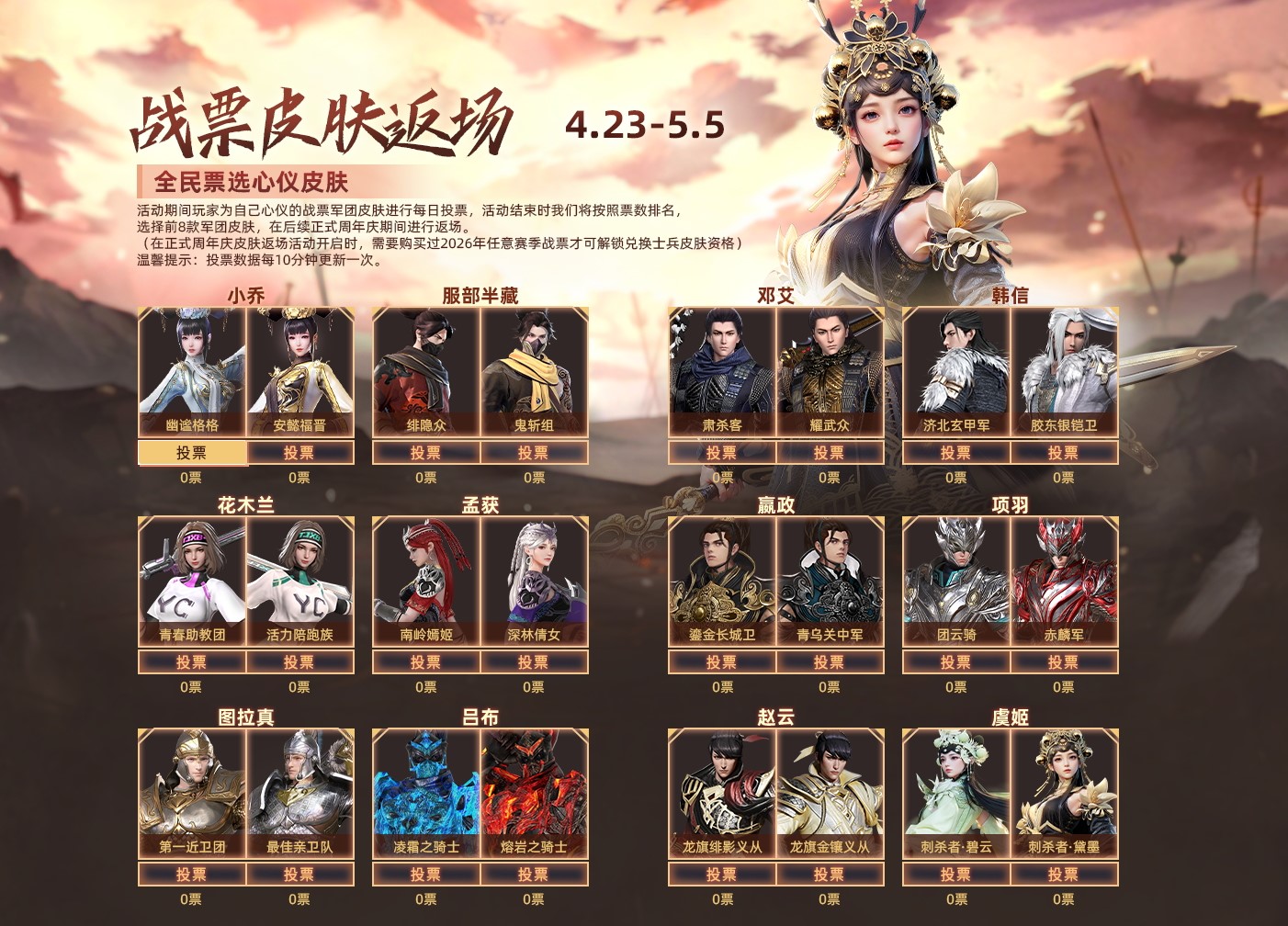 4月23日-5月5日活动期间,每日为心仪的战票兵团皮肤投票,活动结束时我们将按照票数排名的前8款,在后续正式周年庆限时返场!