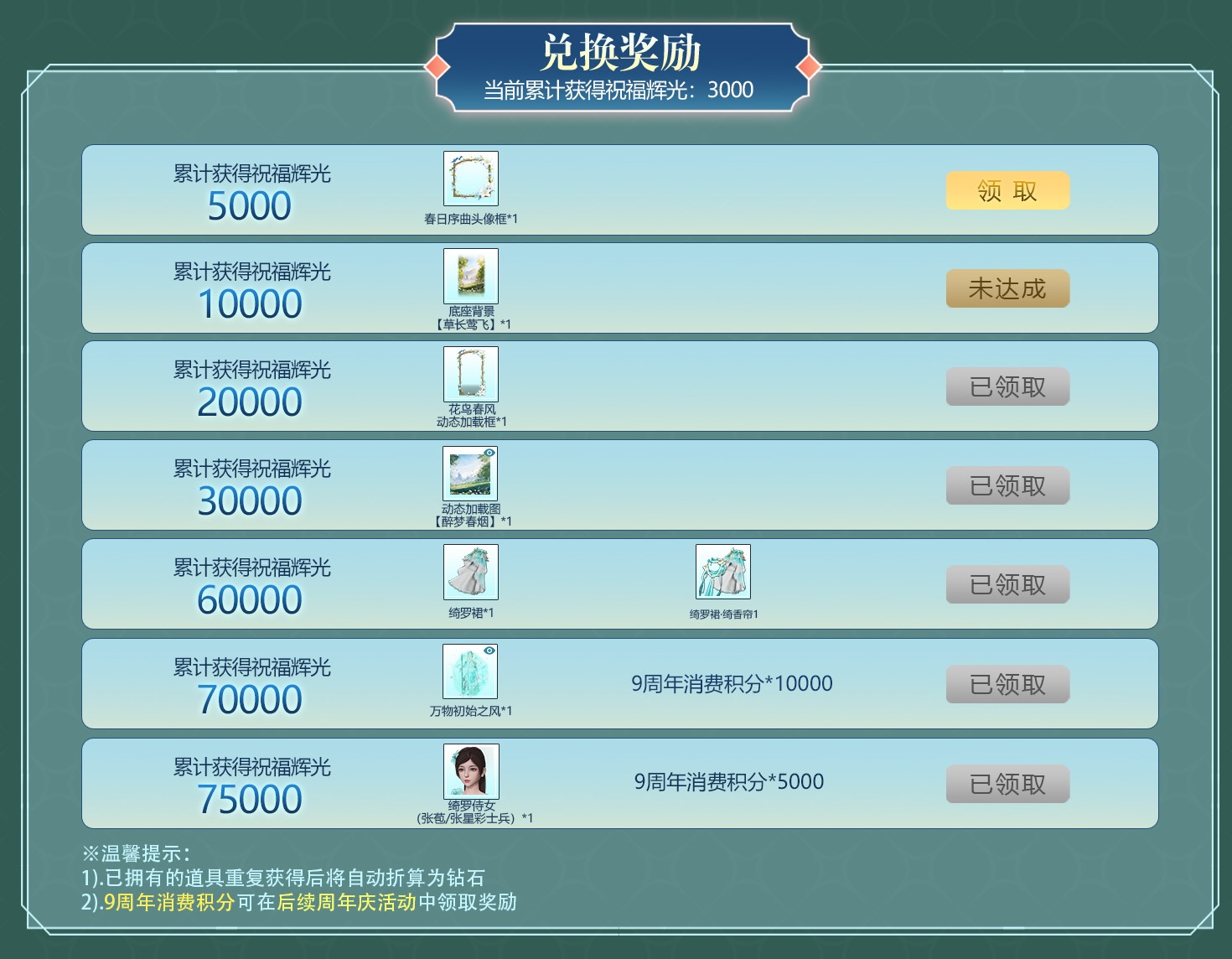 当祝福辉光达到一定数量后,可通过任意方式消耗觉醒积分继续获得祝福辉光。达到指定数量后,可领取新的盲盒配套福利,包含张星彩全新典藏兵皮&配饰、头像框、金色辉石等!
