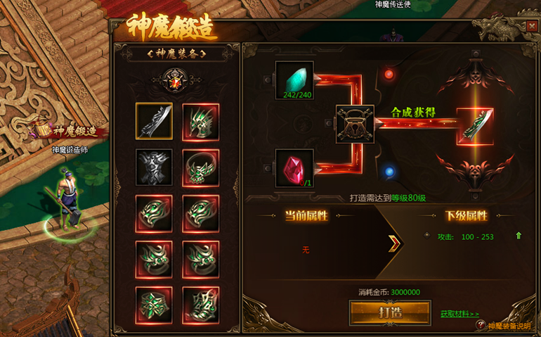 ◆ 可通过锻造师(位于神渊/魔域处)打开神魔装备锻造界面,消耗星云铁和焰尘晶打造神魔装备;另外在传世宝藏里面也可以通过抽奖直接获得哦